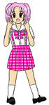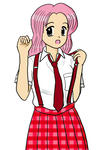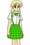 女子高生漫才師。制服デザインは前作の流れを汲んでいますが、創作漫画としては別作品で作っているもので、以前に描いた女子高生芸人の相方です。制服設定ではスカートに付属のサスペンダーは内側のボタンにより取り外し可能ですが、校則では着用を指定。オプションとしてこの上から着るアイボリー色のニットベストがついている他、ネクタイ+半袖ブラウスに代えて、ノータイに白色無地のポロシャツでも可など、やや緩めの設定にしています。