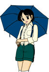 パソコンの中にあった素材から、小道具とポーズを拝借。今回は傘の形と立ち位置を計るために元の画像ファイルをそのまま下書き画像にぶち込んでみるという手法を試してみました。出来上がってから見てみるとやっぱ絵のほうが頭デカいし、デカいほうがバランス取れるもんなんやってことがわかるものですね。
